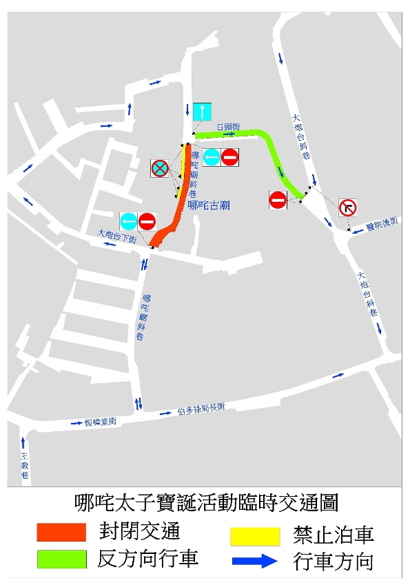 日头街临时反方向行车,即车辆只可由哪咤庙斜巷往大炮台斜巷方向行驶 |
