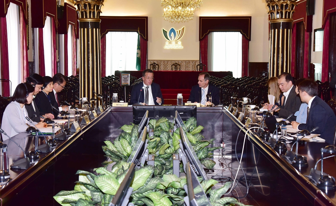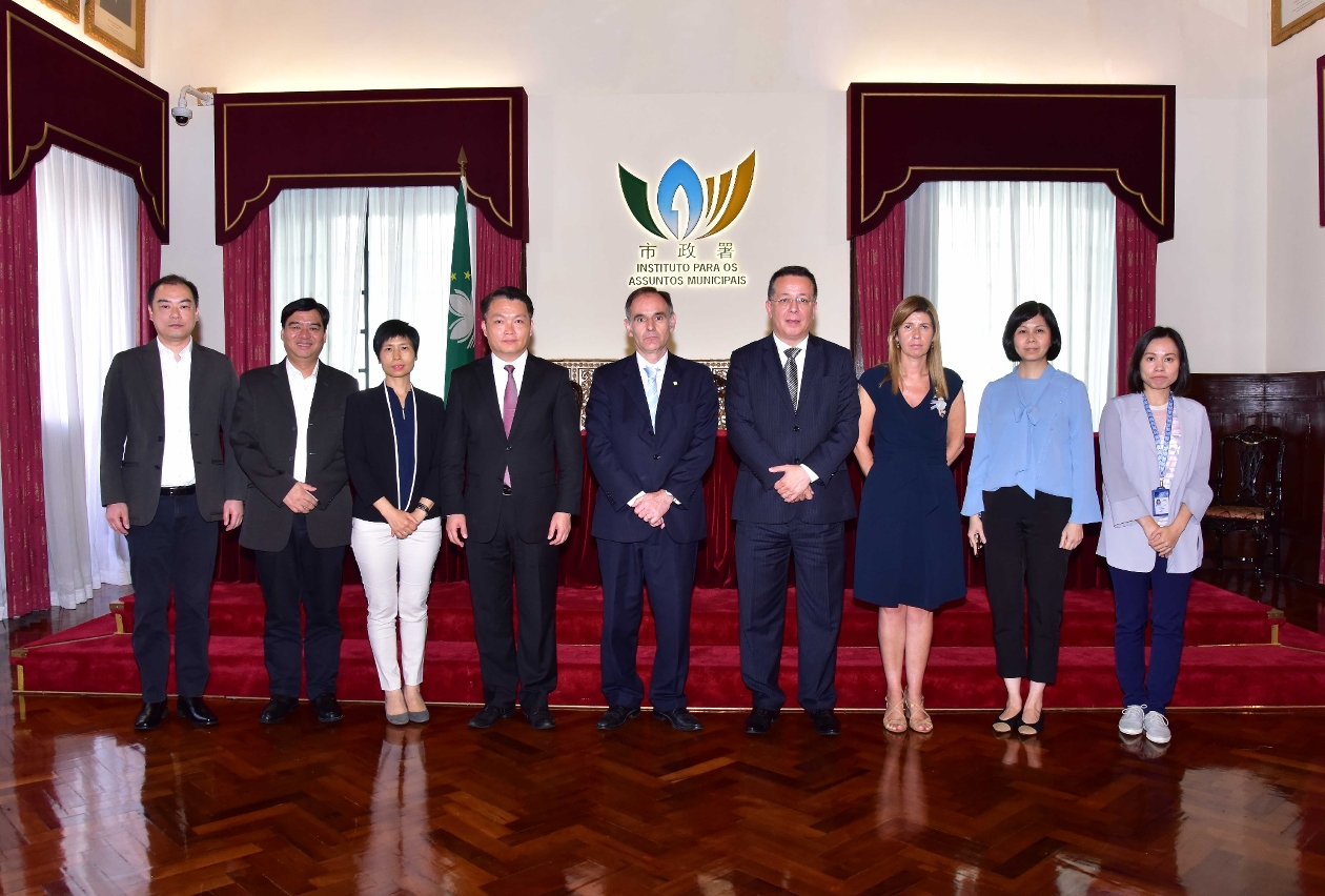 市政署市政管理委员会主席戴祖义、副主席李伟农、委员吴秀虹及相关部门主管于七月五日在市政署大楼礼堂,与到访本澳的葡萄牙食品安全和经济管理局监察长Pedro Portugal Gaspar及国际关系办公室处长Ana Catarina Mendes Leal举行食安合作工作会议。