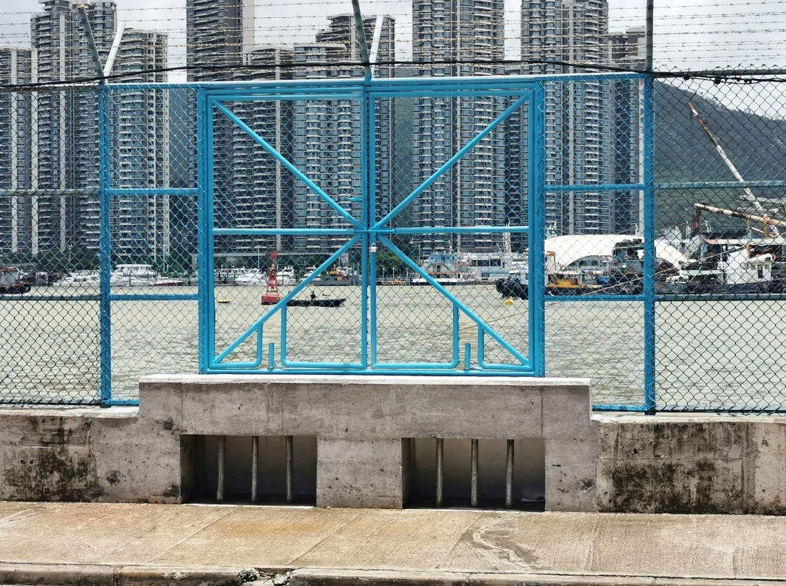 另一方面,为避免大型垃圾阻塞拍门,同时防止偷渡行为,退水拍门亦设有金属栏栅。每个拍门组件重约140公斤,当出现严重风暴潮时,拍门依靠自重及潮水压力实现闭合,并辅以防水胶边减少渗漏率,能有效防止海水在短时间内涌入内港。