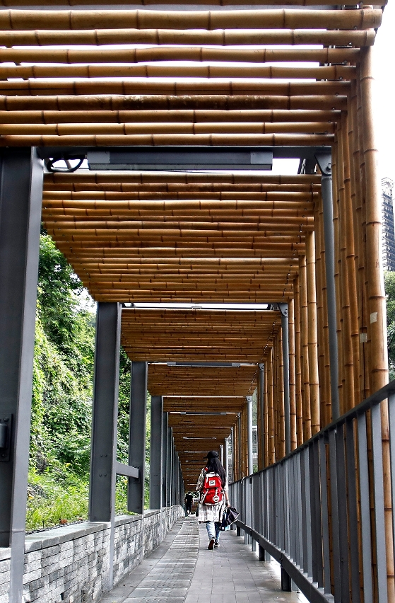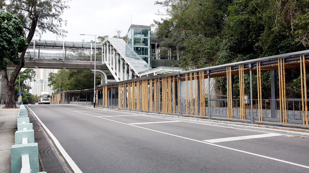 全长约800米的地面式走廊行人道设有玻璃顶盖,提供遮风挡雨的功能。设计上以竹作装饰,配合周边大潭山的自然环境。除有金属围栏外,路边还设置了花圃,以增加绿化及环保自然元素。