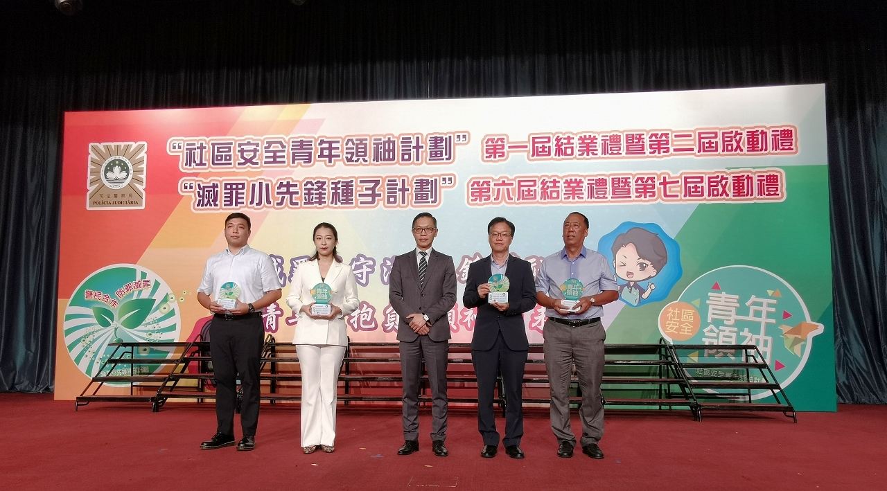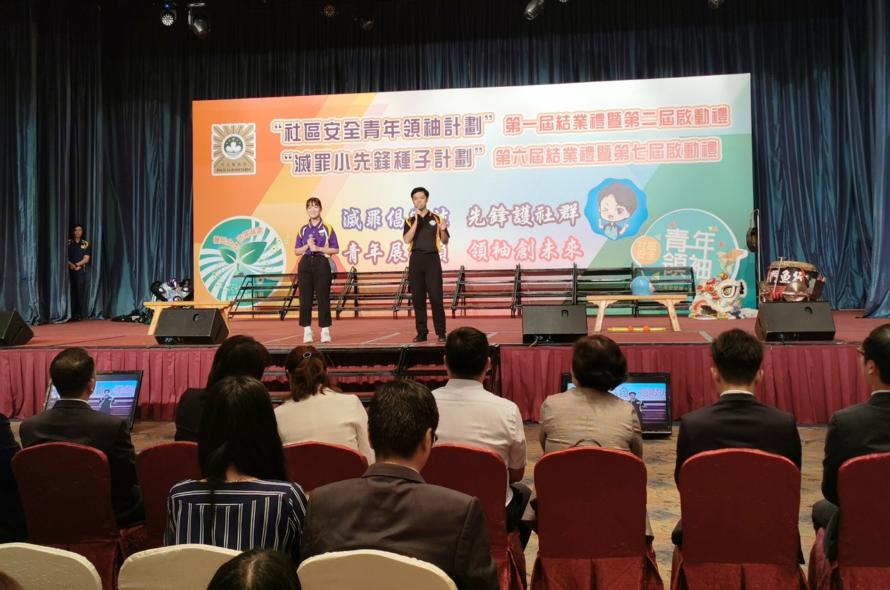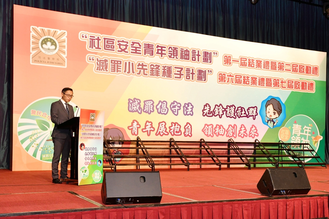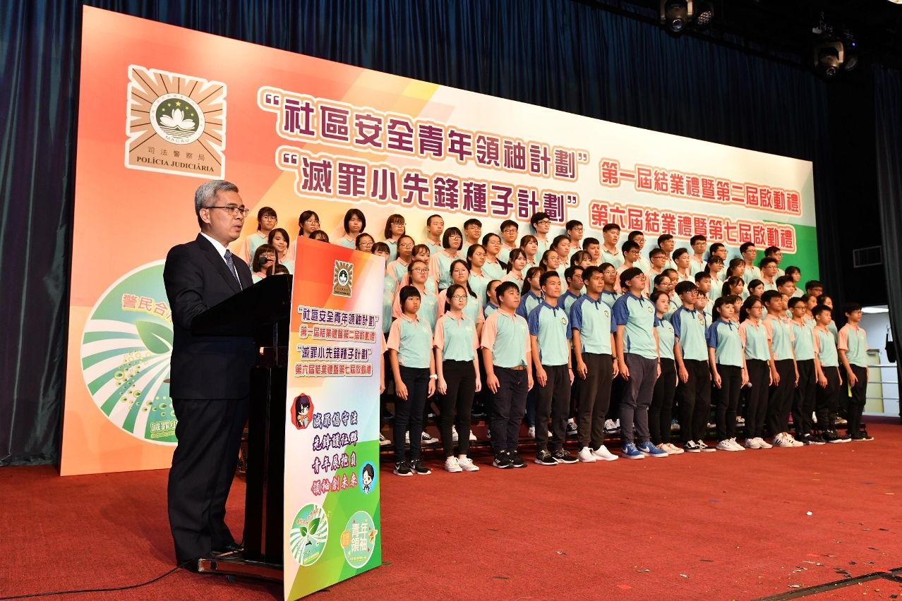 为积极配合和落实澳门特区政府的青年政策,提升青少年的防罪意识和能力,司法警察局举行第一届“社区安全青年领袖计划”结业礼暨第二届启动礼、第六届“灭罪小先锋种子计划”结业礼暨第七届启动礼。保安司司长黄少泽勉励学员要把握国家发展机遇,努力提升自己,强化个人能力,从身边小事做起,懂得尊师重道,勇于作出承担,积极奉献社会。司警局局长薛仲明期望全体学员能够坚持不懈地学习、巩固防罪和法律知识,从实践中锻炼和提高领袖能力,在朋辈间充份发挥自己的正面影响力,协助警方在社区及校园内外传递防罪灭罪讯息。