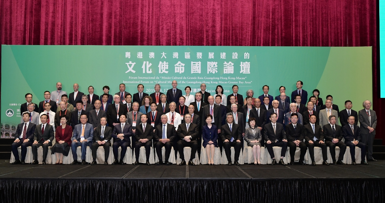 “粤港澳大湾区发展建设的文化使命”国际论坛开幕式上午9时半举行,澳门特别行政区行政长官崔世安,全国政协副主席何厚铧,香港特别行政区行政长官林郑月娥,中央人民政府驻澳门特别行政区联络办公室主任傅自应,广东省人民政府省长马兴瑞,中国社会科学院院长谢伏瞻,中华人民共和国外交部驻澳门特别行政区特派员公署特派员沈蓓莉,澳门特别行政区立法会主席高开贤,中国发展研究基金会副理事长刘世锦,全国政协常委、凤凰卫视董事局主席兼行政总裁刘长乐,中央人民政府驻澳门特别行政区联络办公室副主任薛晓峰,澳门特别行政区政府行政法务司司长陈海帆、经济财政司司长梁维特、社会文化司司长谭俊荣、运输工务司司长罗立文,国家发展和改革委员会副秘书长程晓波,以及国家文化和旅游部港澳台办公室主任谢金英出席并主礼。