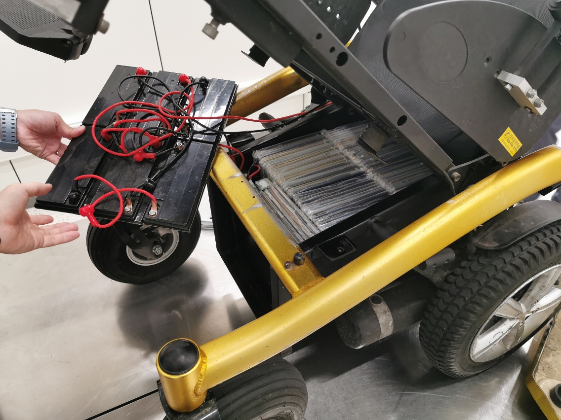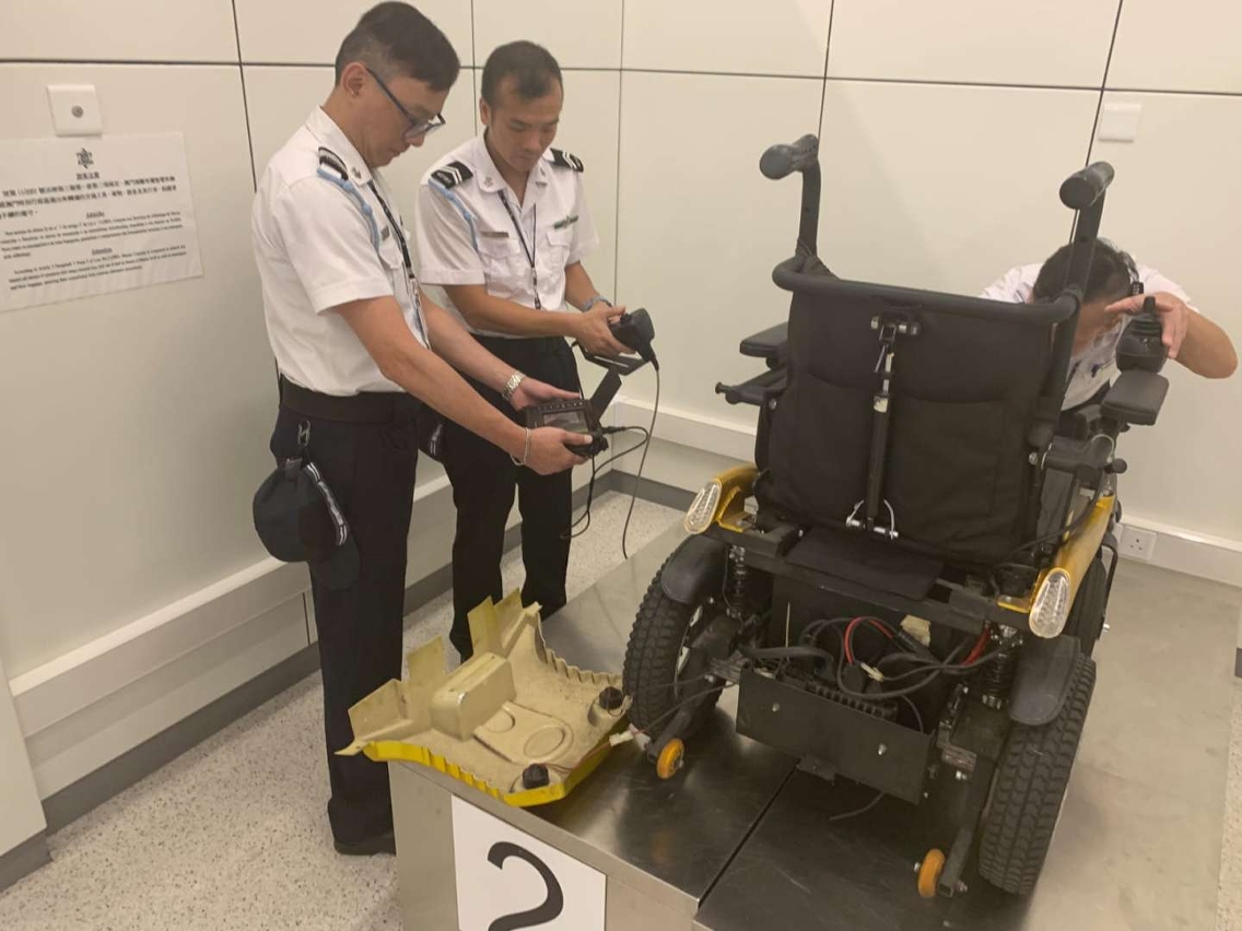 本月16日下午,澳门海关接香港海关情报通知,怀疑一名男子以其乘坐的电动轮椅作掩饰,走私电子产品到澳门。澳门海关根据情报锁定一名嫌疑旅客,并在港珠澳大桥澳门口岸成功截获一名具有相关特征的入境男子,经检查,发现该名男子乘坐的轮椅放置电池之位置异常及有改装过的迹象,关员随即利用检查设备(内窥镜)对轮椅进行深入检查,在轮椅座位下的伪装电池内发现藏有一批包括智能电话的电子产品,经详细检查及核实,查获物品包括有: 同一品牌的旧智能电话共208部、不同品牌的电子晶片共95张。