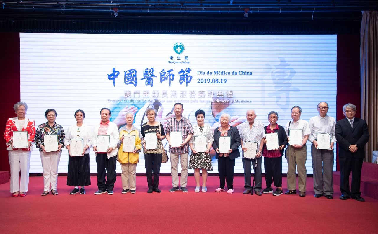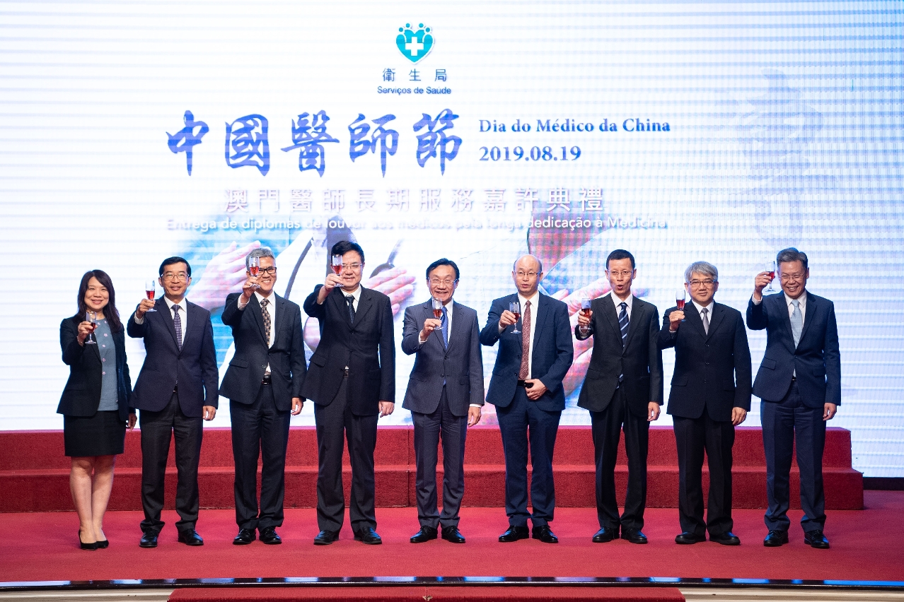 为响应国家将每年8月19日定为「中国医师节」,以弘扬无私奉献的专业精神,嘉许长期投身医疗工作的医师,卫生局今晚(8月19日)举行了「中国医师节」澳门医师长期服务嘉许典礼。出席嘉宾包括社会文化司谭俊荣司长、中央人民政府驻澳门特区联络办公室薛晓峰副主任、宣传文化部殷汝涛副部长,外交部驻澳门特派员公署办公室主任朱夕其参赞,社会文化司司长办公室叶炳权主任,立法会陈亦立议员,卫生局李展润局长,暨南大学澳门校友会马有恒会长,医疗事故鉴定委员会委员,医务委员会委员,本澳多间医疗机构、医务协会代表等。