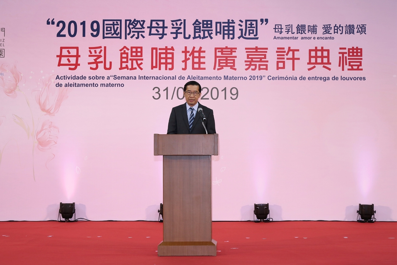 卫生局代局长郑成业在致辞中表示,今年已是卫生局第四年举办“母乳喂哺嘉许典礼 ”,经过近年大力推广,2018年出生的婴儿曾以母乳喂哺率为92.72%,纯母乳喂哺婴儿达6个月或以上、继续以母乳喂哺婴儿至1岁或以上、喂哺2岁或以上的整体数据都得到持续提升,而自2016年社会文化司优先推动辖下部门增加母乳喂哺空间至今,已逐步推广至其他政府部门及私营机构,截至今年8月底,全澳公/私营机构已设立226间母乳喂哺室(包括:社会文化司辖下14个部门的办公地点及其管辖的场所共134间、其他政府部门共25间,私营企业合共67间。),成绩令人鼓舞。卫生局为拓展支持母乳喂哺到社区上的不同阶层,鼓励机构/企业实施母乳友善工作间措施,让返回职场的妈妈能够持续喂哺,已推出「营造友善工作间计划」,在短短3个月内,愿意参与计划的公/私营机构已达139间,标志着本澳推广母乳喂哺工作正踏入新里程,不再局限于医疗场所,获得社会的广泛支持与认同。
