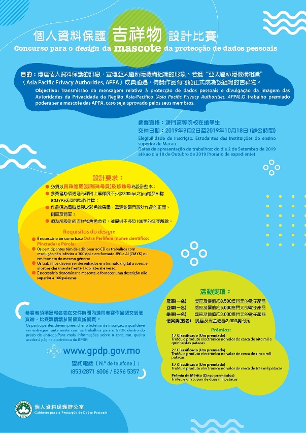 由个人资料保护办公室举办的“个人资料保护吉祥物”设计比赛现正接受报名,有意参赛的高等院校学生,由即日起至10月18日,可填妥报名表,连同参赛作品于办公时间内递交至个人资料保护办公室。