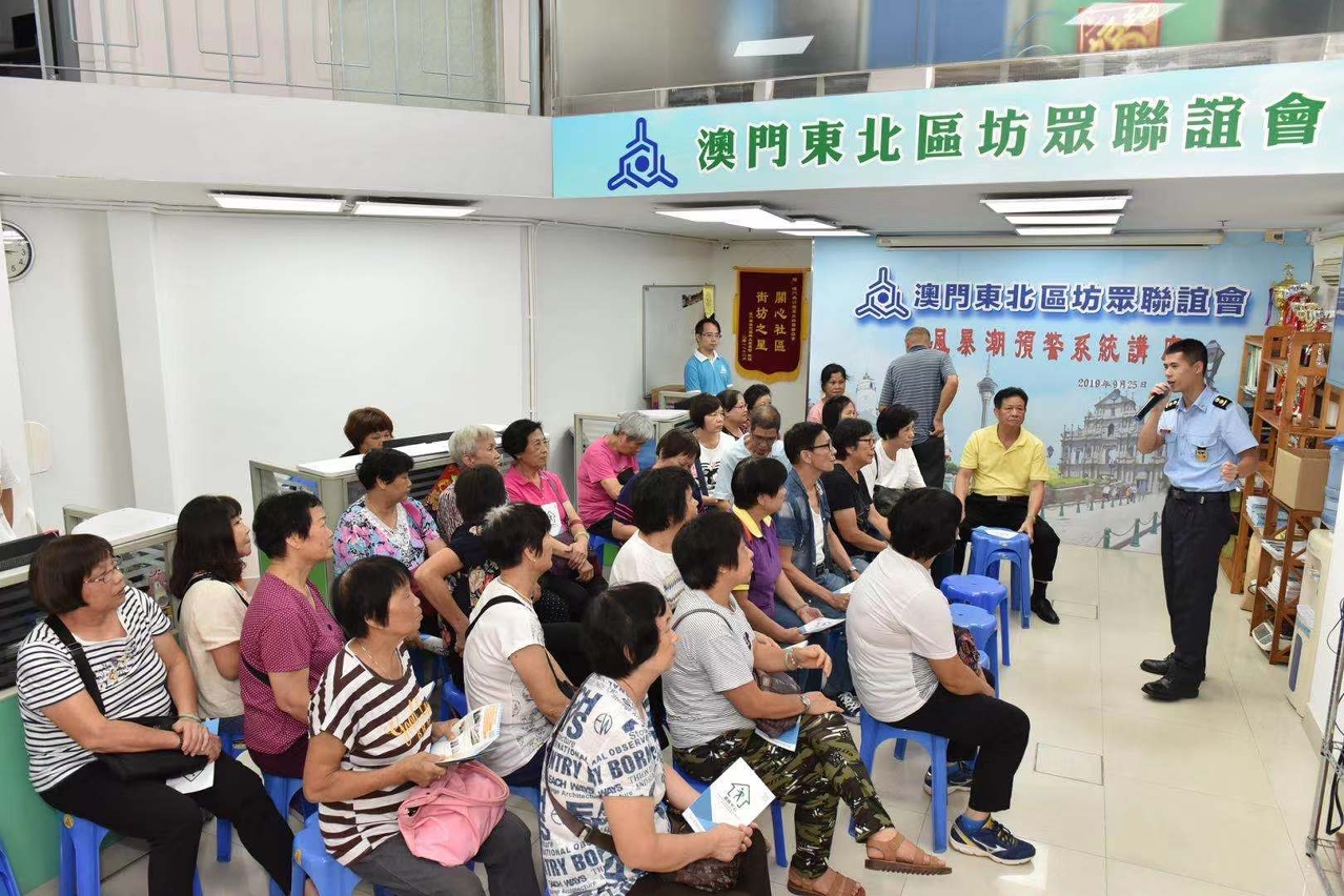 为进一步加强市民对灾害的防范意识和自救能力,保障市民于台风期间风暴潮来袭时,能够按照当局指示迅速、安全有序撤离,在警察总局统筹下,于2019年9月25日,消防局联同社会工作局,透过向市民公开报名形式,于东北区坊众联谊会会址举行“台风期间风暴潮低洼地区疏散撤离计划”讲座,旨在加深居民对撤离工作的了解,及后进行演习撤离到避险中心,合共有约30名居民参与。