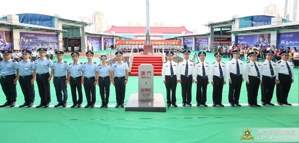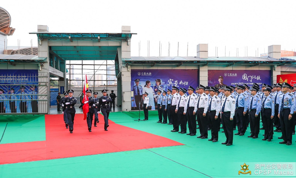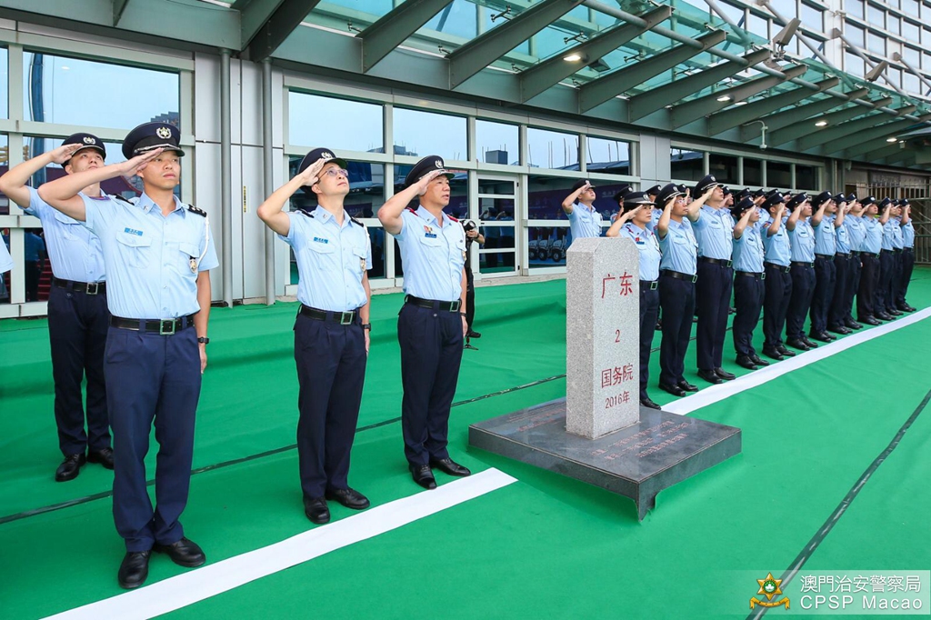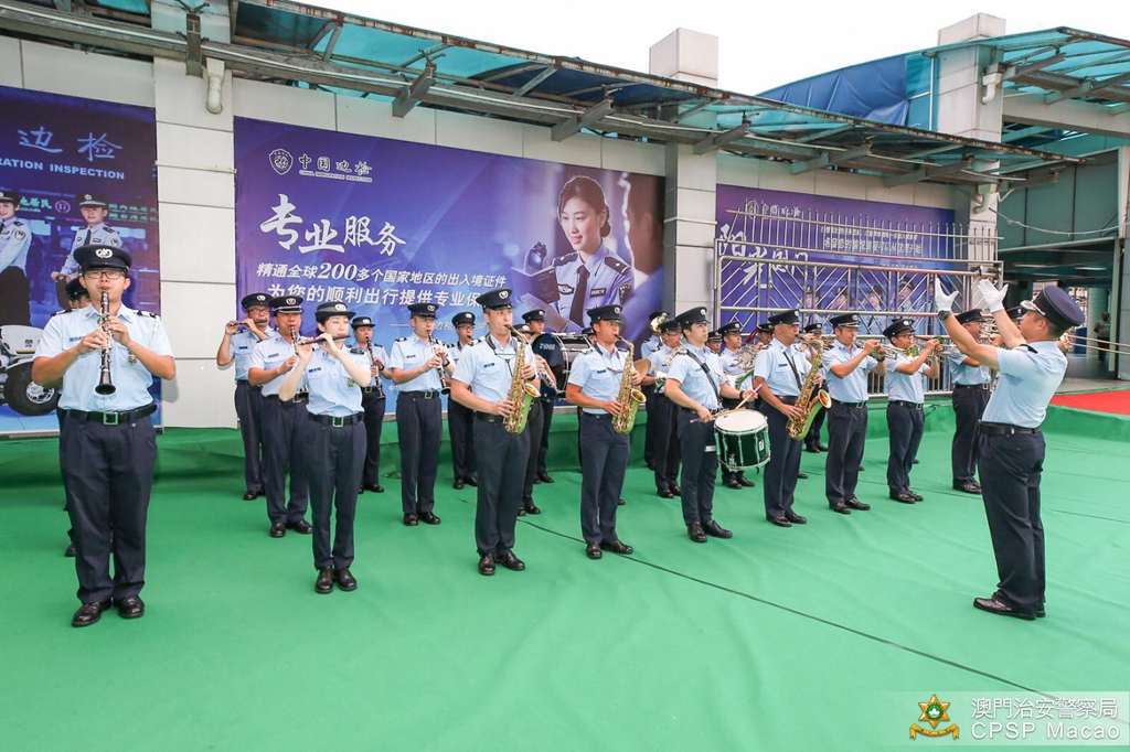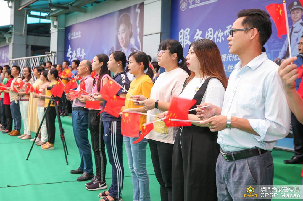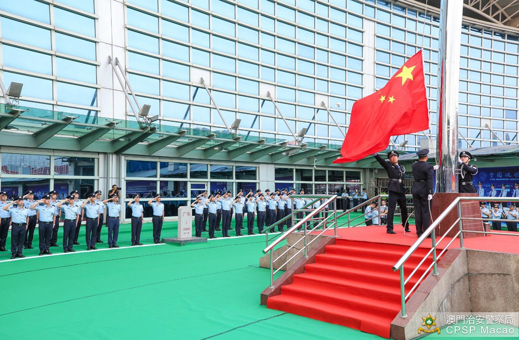 治安警察局梁文昌局长与珠海边检总站涂林总站长分别带领双方领导、主管及前线人员,在关闸出入境事务站与拱北口岸之间的粤澳边界线旗杆处参与庄严的升国旗仪式,随后双方人员合唱一曲《歌唱祖国》,活动吸引了不少旅客驻足观看。