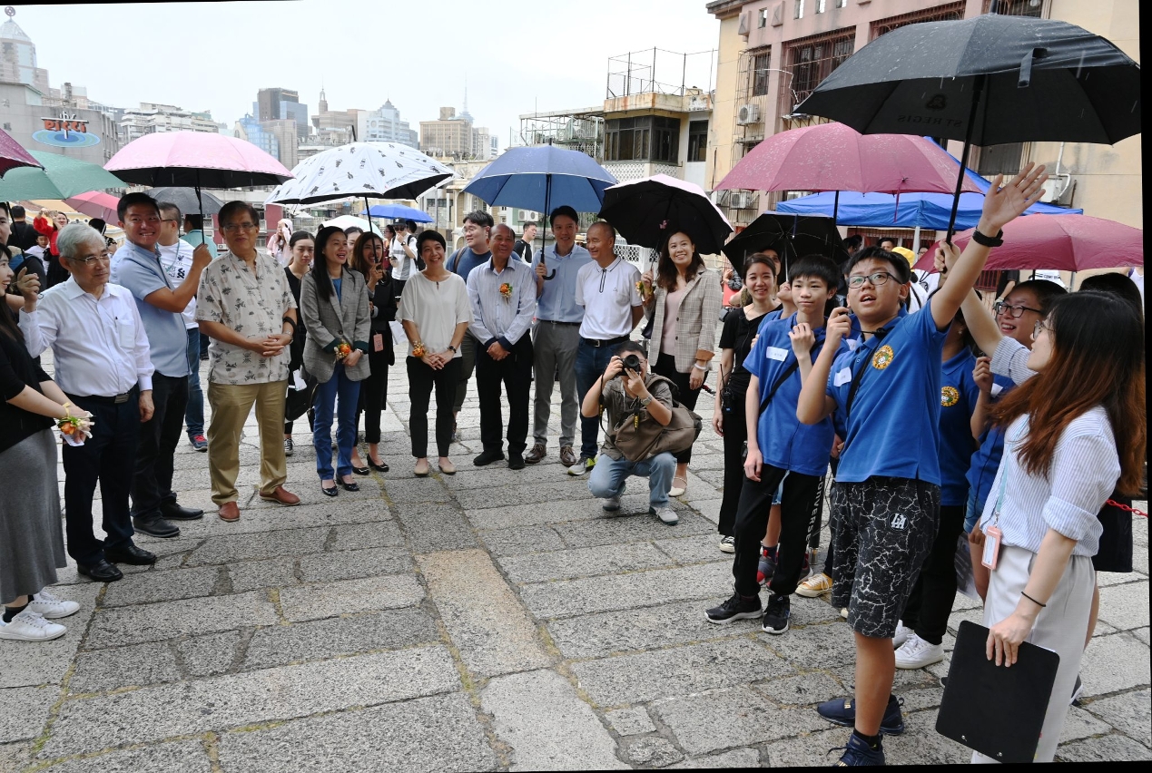 由文化局主办、澳门文化遗产协会承办的《2019年下半年度至2020年上半年度澳门文化遗产小小导赏员实践培训计划》导赏服务启动仪式于今日(10月6日)上午11时在大三巴牌坊前地举行,启动仪式由文化局副局长梁惠敏、教育暨青年局黑沙环活动中心主任蔡敏芝、司法警察局社区警务及公共关系处关注少年组职务主管朱惠敏、大三巴哪咤庙值理会会长叶达、澳门文化遗产协会副理事长李雪芬及资深导赏员冯紫云主礼。并由观礼嘉宾包括文化遗产委员会委员李业飞、李熙烨、郑国强、文化局文化遗产厅厅长蔡健龙、文化遗产保护处代处长何卓锋,以及一众家长和学员共同见证,现场气氛热烈 。