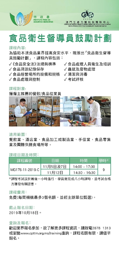 为协助本澳食品业界做好食品安全管理工作,市政署委托澳门生产力暨科技转移中心开办“食品卫生督导员课程”,十一月份课程将于十一月五日在澳门生产力暨科技转移中心举行,报名日期由即日起至十月十八日,鼓励本澳食品业界参加。
