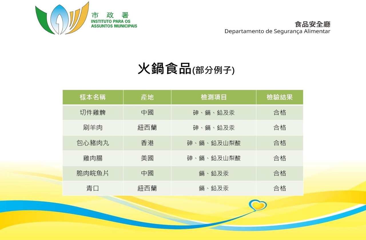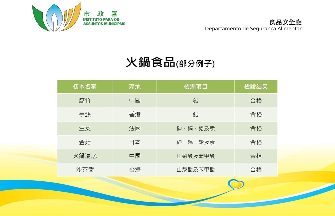 是次专项食品调查,市政署食品安全厅分别抽查本澳百货公司、超级市场等店铺出售的火锅食品,包括肉类及其制品、水产及其制品、蔬菜、火锅汤底及酱料等合共60个样本,进行重金属和食品添加剂检测。当中重金属检测包括砷、镉、铅及汞;食品添加剂检测方面,则包括防腐剂苯甲酸及山梨酸。调查结果显示,所有样本均未见异常。