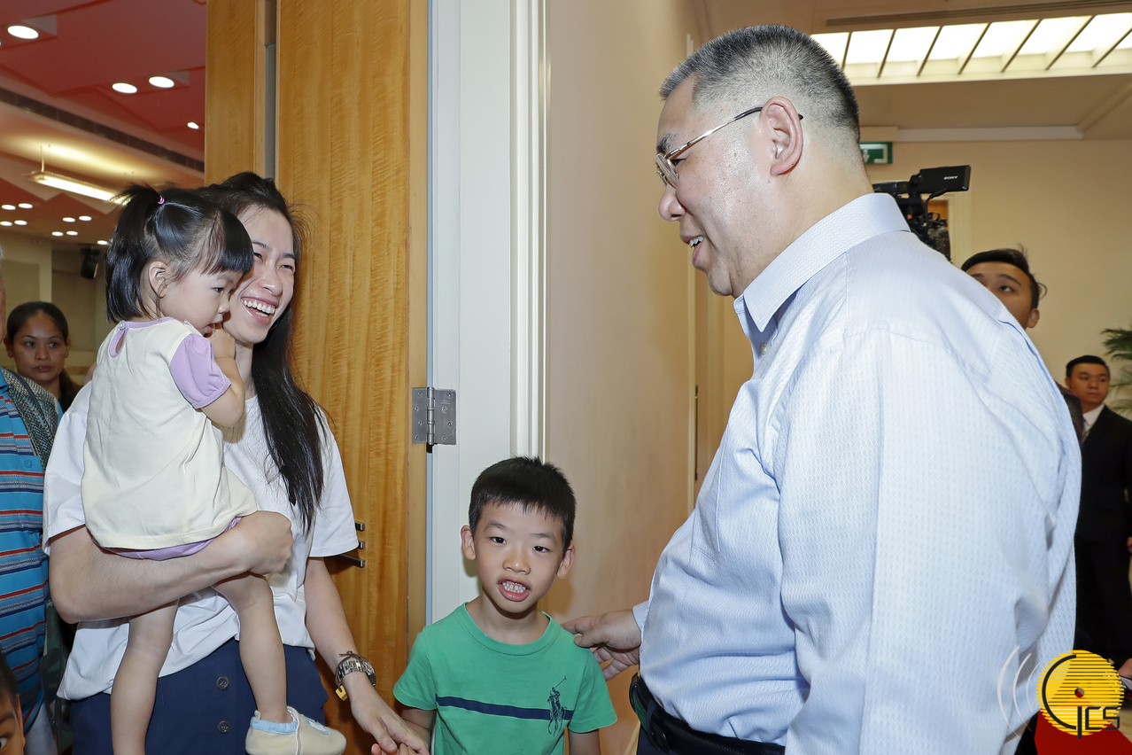 行政长官上午9时许回到政府总部,在行政长官办公室主任柯岚陪同下视察。他在政府总部正门与来澳探亲的游客合照及交谈。她向行政长官表示:「澳门治安好,也感受到澳门居民对游客的热情。」行政长官亦祝福与她同行的小孩快高长大,身体健康。