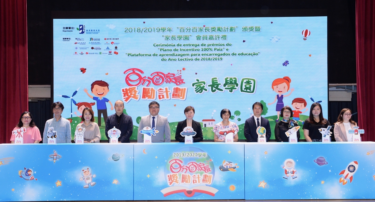 为表扬过去一年来热心及积极参与家长教育及亲子活动的家长,教青局于10月20日上午10时30分在中葡职业技术学校礼堂举行2018/2019学年“百分百家长奖励计划”颁奖暨“家长学园”会员嘉许礼,并举行2019/2020学年“百分百家长奖励计划”启动仪式。出席嘉宾包括教青局代局长梁慧琪、教育厅厅长江毅、邮电局通讯博物馆总馆长黄锦欣、澳门科学馆教育及展品总监梁思聪,以及60多位来自教育机构及社团的代表。
