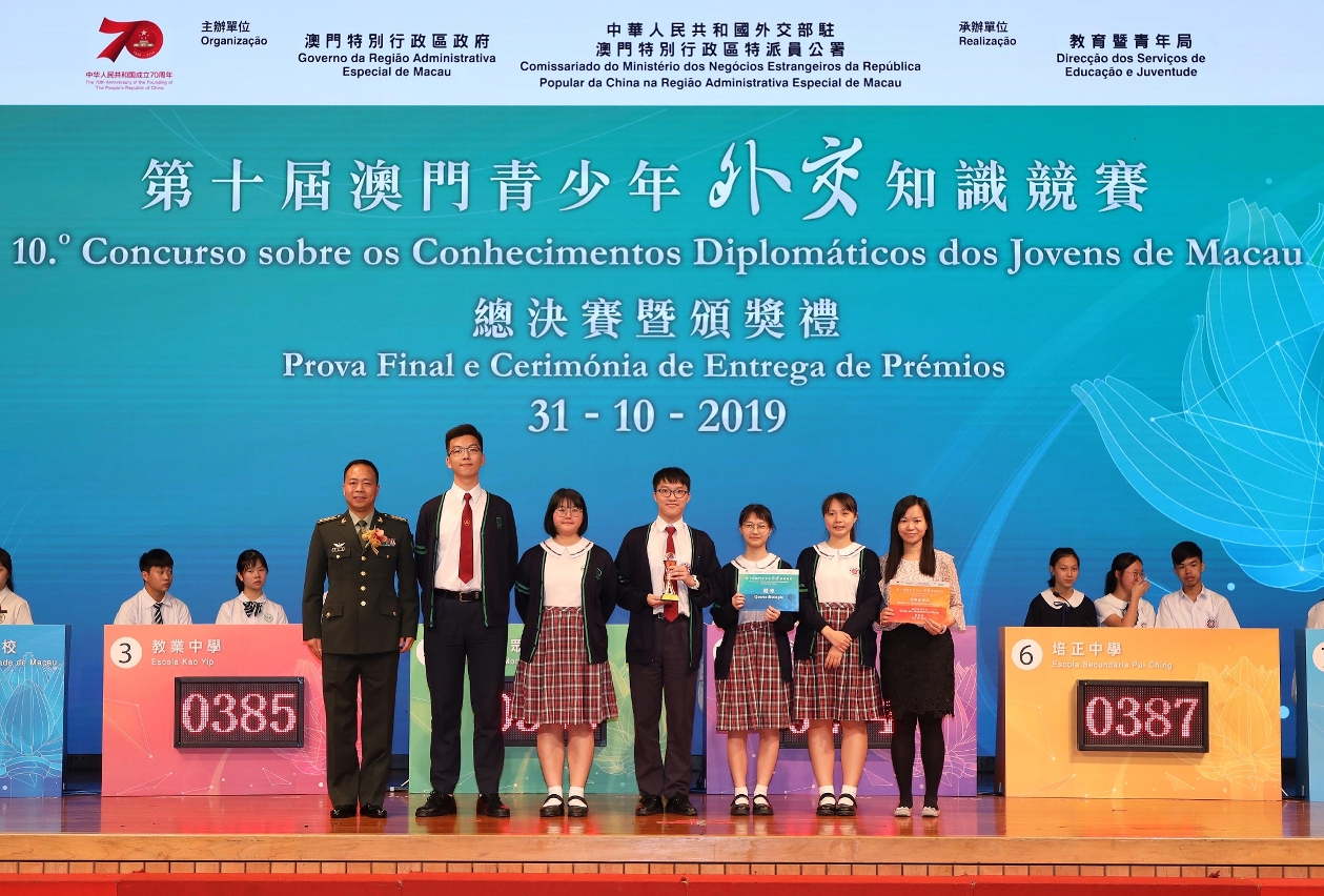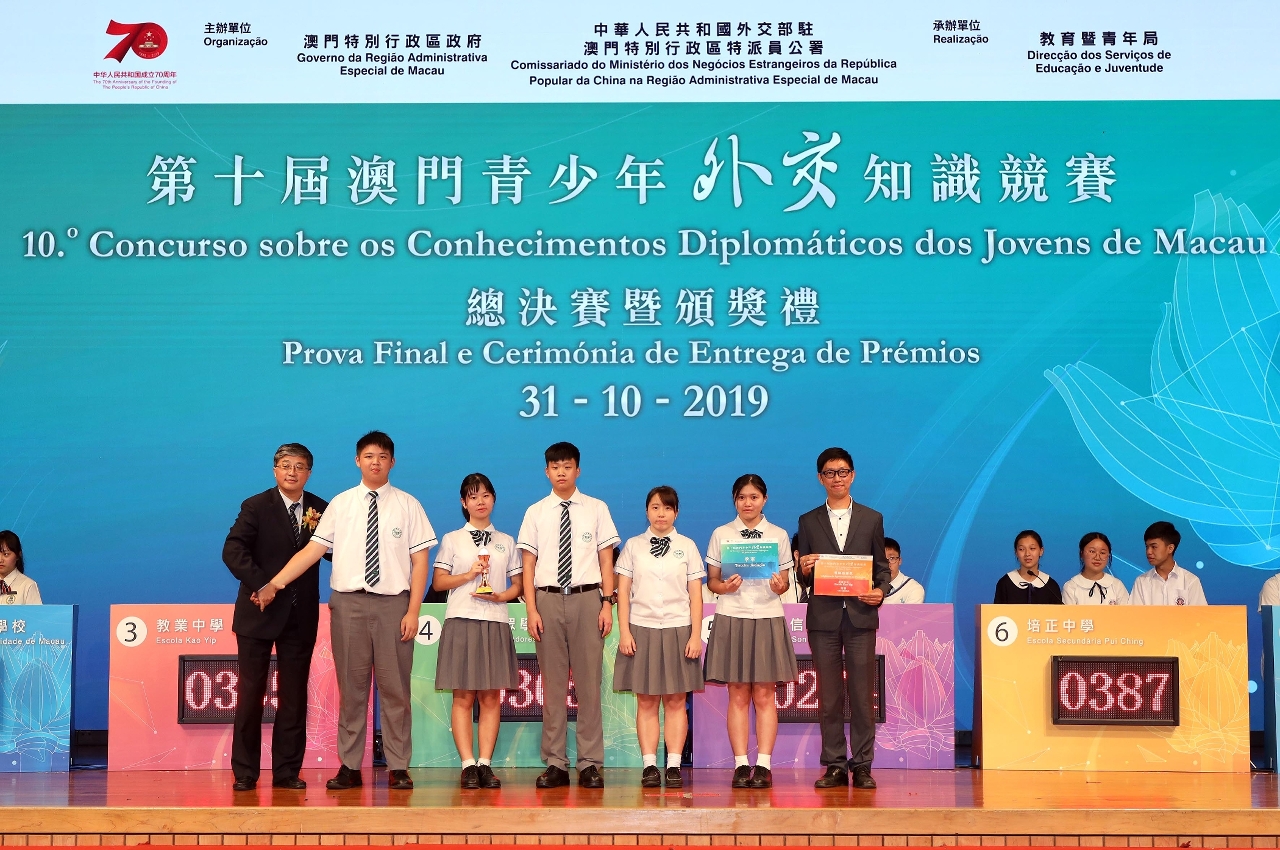 经过9月21日的初赛,8支队伍从33间学校中脱颖而出晋身总决赛。总决赛当天,有超过600名学校的领导、师生出席支持,为参赛同学打气,气氛热烈。比赛设4个环节,包括选择题、填充题、论述题和抢答题,内容围绕国家外交政策、国际形势和时事、以及新中国成立70周年成就等,以扩阔学生的知识面,启迪思维。经过一轮激烈的角逐,最终结果是培正中学、圣公会(澳门)蔡高中学、教业中学及澳门坊众学校依次夺得冠、亚、季及殿军。获得优异奖的学校包括同善堂中学、广大中学、澳门大学附属应用学校及澳门浸信中学,晋身总决赛队伍有难得的机会前往北京及内地主要城市进行交流和参访,到访北京国家外交部,亲身参与国家外交部新闻发布会,并到访国家主场外交的场馆,感受国家的强大和瞭解高速发展的情况。