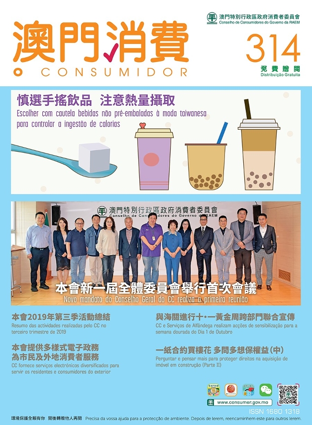 第314期《澳门消费》报导消委会近月工作及各项电子服务,市民除可在消委会网页(www.consumer.gov.mo)及微信(WeChat)帐号浏览到新一期《澳门消费》,亦可于高士德大马路26号何鸿燊夫人大厦消委会办事处、黑沙环新街52号政府综合服务大楼1楼M区、水坑尾方圆广场政府资讯中心、文化局属下各公共图书馆、八角亭图书馆及澳门文化广场等地点免费索取第314期《澳门消费》。