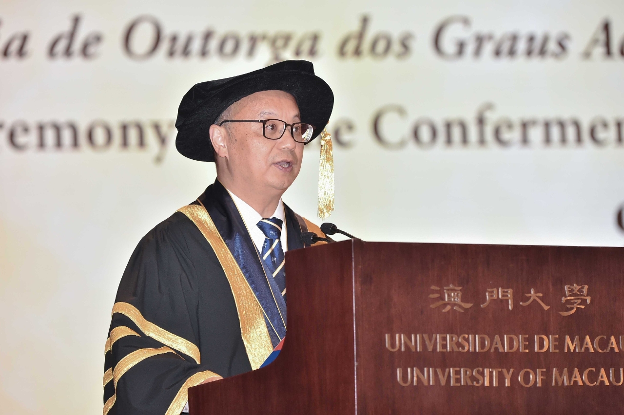 澳门大学今(9)日举行“2019年荣誉学位及高等学位颁授典礼",八百多名博士、硕士和学士后文凭/证书课程的学生获颁毕业证书。典礼上,澳门特别行政区行政长官兼澳大校监崔世安代表、社会文化司司长谭俊荣表示,澳门特区政府将继续支持大学一流学科的建设,期盼澳大培养更多爱国爱澳人才,创造更多科研成果,为澳门和国家的可持续发展作出更大的贡献。
