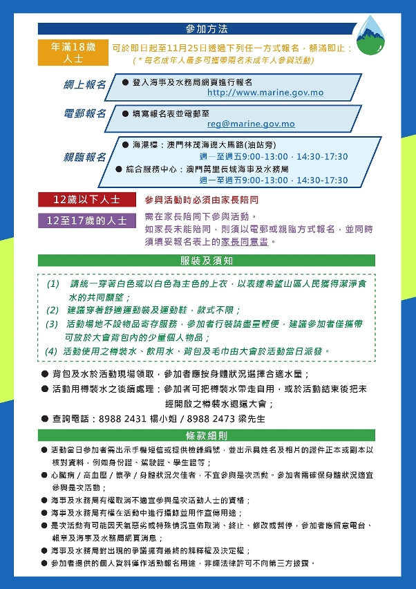 “2019攀山背水”活动名额为500人,需提前报名,先到先得,参加者于活动当日可获赠精美背包及毛巾。市民可于11月25日或之前,登入海事局网页(www.marine.gov.mo)进行网上报名,亦可透过电邮方式(reg@marine.gov.mo)报名,或于办公时间内亲临万里长城海事及水务局综合服务中心或林茂塘海港楼提交报名表。有关活动的报名方式、条款及细则可浏览海事局网页。