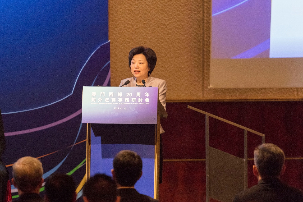 行政长官崔世安和外交部代表外交部驻澳门特区特派员公署特派员沈蓓莉分别在开幕式上致辞。行政长官崔世安在致辞时表示,回归祖国20年来,特区政府与中央政府一直保持密切沟通与配合,严格按照《宪法》和《基本法》处理各类对外法律事务。在中央政府的大力支持和协助下,澳门对外交往的领域明显拓展,参与国际事务的水准显着提升,国际知名度和影响力大幅增加。