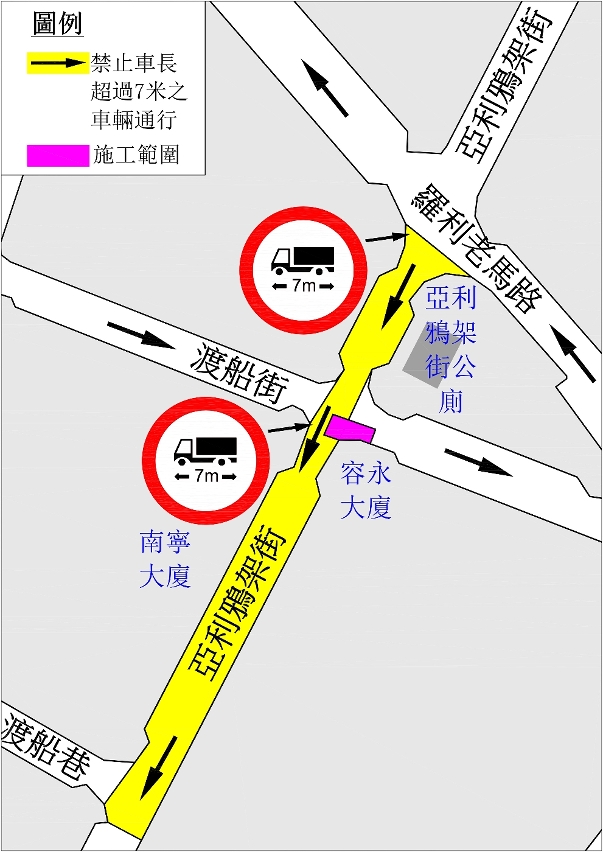 禁止车身长度超过7米以上车辆进入介乎罗利老马路与渡船巷之间一段亚利鸦架街 |