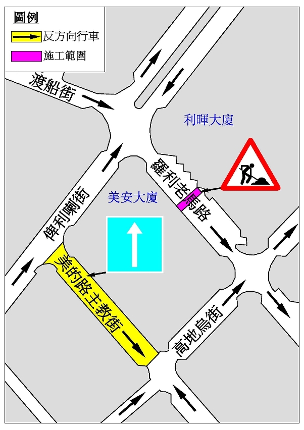 介乎俾利喇街与高地乌街之间一段美的路主教街实施反方向行车,即车辆由俾利喇街往高地乌街方向行驶。 |