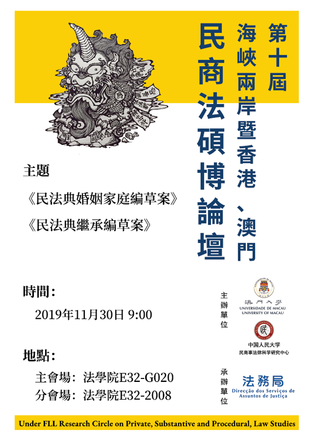 澳门大学法学院将于11月30日(周六)举办“第十届海峡两岸暨香港、澳门民商法硕博论坛”,今届主题为《民法典婚姻家庭编草案》和《民法典继承编草案》,欢迎有兴趣人士参加。