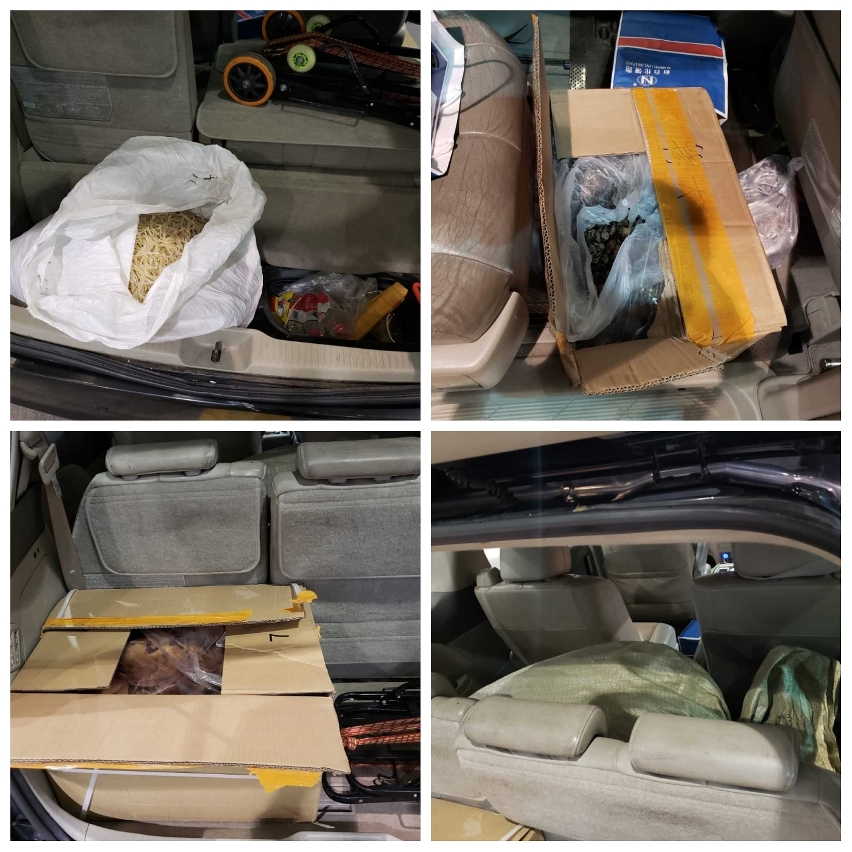 本月26日,一辆粤澳两地牌私家车经关闸口岸车道入境时,被海关风险管理系统判断为需接受详细检查,海关关员进行检查时发现私家车后排座位、车尾箱及地台位置载有大量干货,包括蚝干、花胶、鱼干及干螺片,合共62公斤。上述被检获的物品均未经检疫,且部分物品须预先申领准照方可进口本澳。海关根据第7/2003号法律《对外贸易法》的相关规定,对涉案司机作出起诉,一经判罚,可科处澳门币5千元至10万元罚款,而查获的货物会宣告归澳门特别行政区所有。