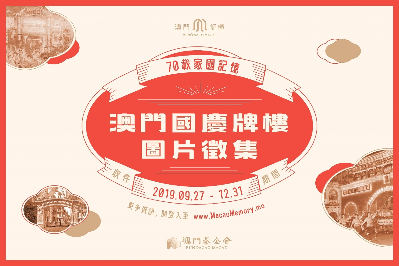 为庆祝新中国70华诞,澳门基金会的“澳门记忆”文史网 (www.MacauMemory.mo) 特于网上开展“70载家国记忆——澳门国庆牌楼图片征集”,邀请市民携手共建国庆回忆。为鼓励更多市民参与,增加图片之丰富度,收件期将由11月30日延至12月31日,欢迎有兴趣人士踊跃投稿。