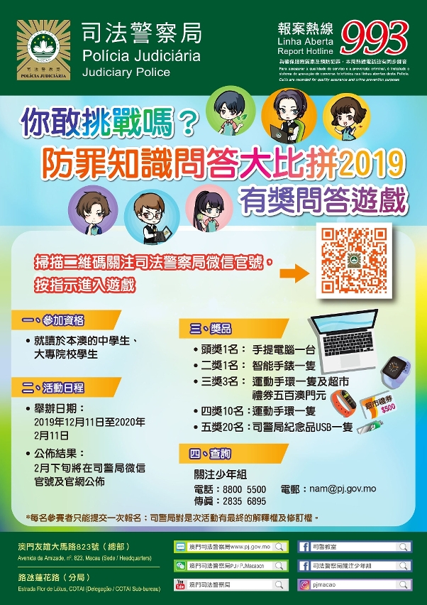 凡于本澳就读的中学生及大专院校学生均可经司警局微信官号“澳门司法警察局PJ/PJMacaocn”或扫描有关官方帐号的二维码参加活动,完全答对的参加者可进入抽奖环节,赢取包括手提电脑、智能手表及运动手环等丰富礼品。抽奖结果将于2020年2月下旬在司警局微信官号及官网公布。
