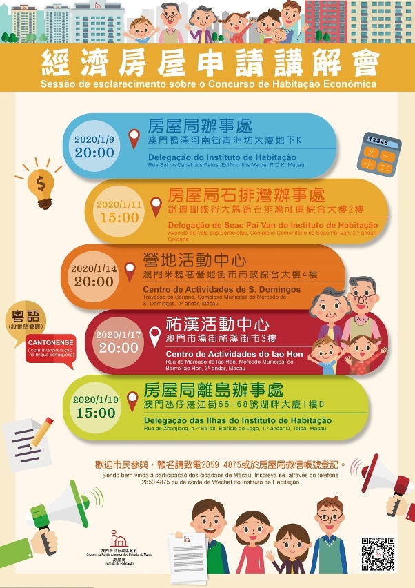 其中,本周内共举行两场经屋申请讲解会,首场讲场会将于1月9日(星期四)晚上8时在房屋局办事处(澳门鸭涌河南街青洲坊大厦地下K)举行;第二场于1月11日(星期六)下午3时在房屋局石排湾办事处(路环蝴蝶谷大马路石排湾社区综合大楼2楼)举行。
