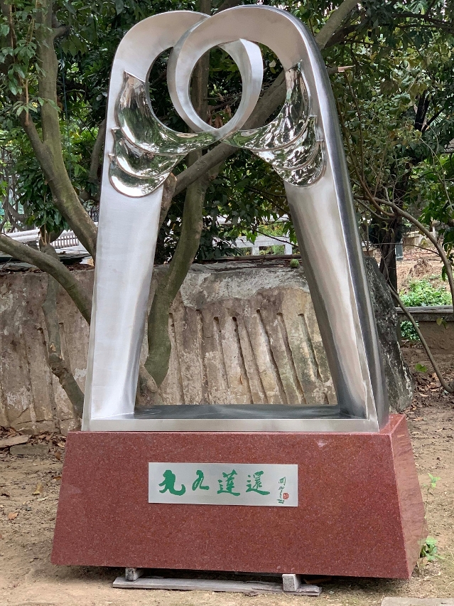 《九九莲环》高2.1米,阔1.5米,重250公斤,底座为印度红大理石。雕塑匠心独运,寓意深刻:两个相对 的“9”字犹如世纪之门;“9”字上端巧妙地交织紧扣,构成一朵含苞待放的白莲花,寄寓对澳门回归的喜悦和祝福。曹崇恩教授在澳门回归祖国二十周年之际,赠送其作品《九九莲环》予文化局,意义重大。