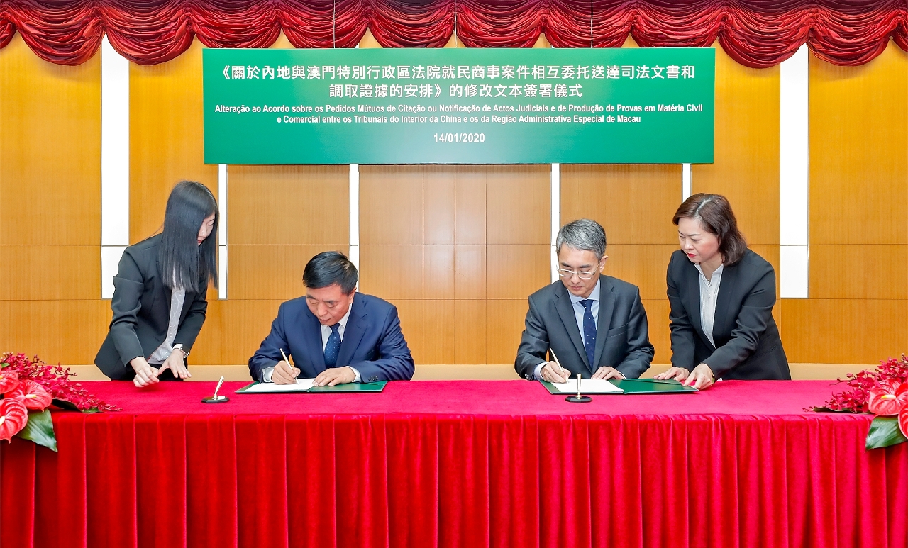 行政法务司司长张永春和最高人民法院副院长杨万明今(14)日在政府总部签署《关于内地与澳门特别行政区法院就民商事案件相互委托送达司法文书和调取证据的安排》的修改文本。原《安排》于二零零一年八月十五日签署。修改文本将于二零二零年三月一日生效。