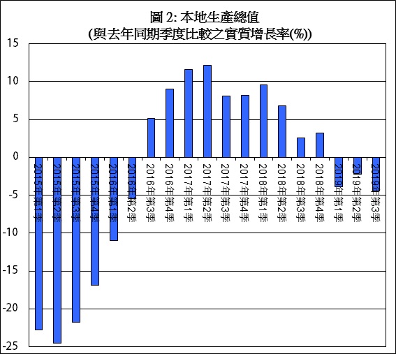 美国经济预计在2020年增长1.7%,而欧元区经济增长率则预计为1.4%。中国内地方面,2019年第3季增长为6.0%,较第2季的6.2%进一步下跌。这些发展亦令澳门另一个主要服务出口市场 -- 香港增长放缓, 加上本身的政治动荡,2019年第3季香港经济收缩2.9%。