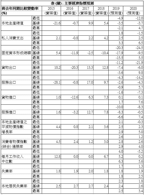 整体而言, 2020年经济增长预计持续下滑,下跌3.7%。而预测区间,由较悲观的下跌12.0%至较乐观的上升4.7%。基于外围经济变化迅速,研究团队将会定期更新预测。