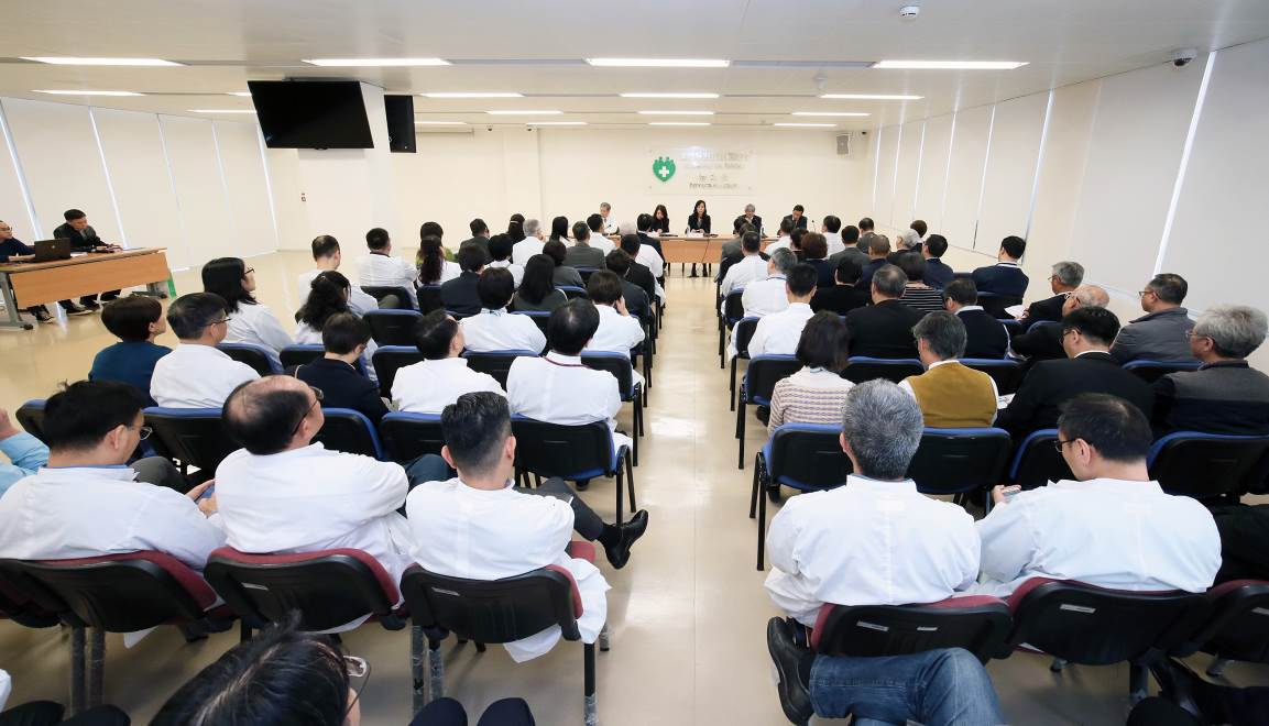 社会文化司司长欧阳瑜今(16)日上午在办公室主任何钰珊、卫生局局长李展润、副局长郭昌宇、郑成业及代副局长陈永华等人的陪同下,到仁伯爵综合医院,与卫生局70多名医护人员进行交流。