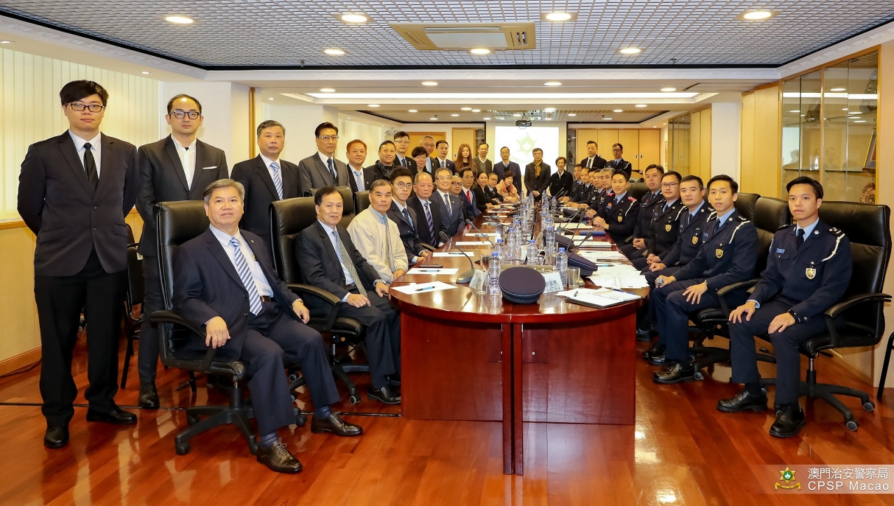 1月16日上午,治安警察局黄伟鸿及梁庆康副局长带领多位主管,在治安警察局总部接待到访的澳门物业管理业商会谢思训会长、澳门街坊会联合总会林文彬副监事长、澳门不动产管理专业技术人员协会杨永泰会长等约三十位代表,就冬防工作进行座谈。