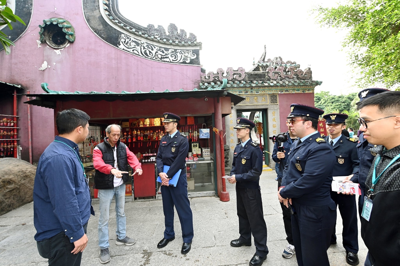 是次巡查由文化局辖下文化遗产保护处代处长何卓锋及消防局防火厅副一等消防区长杨世安一行参与,到澳门及离岛各所庙宇现场检查消防和用电设备,向管理者瞭解农历新年期间庙宇的香火和祭祀安排,提醒庙宇管理者注意消防安全及理顺管理工作,提前做好新年祭祀高峰的应对措施,包括:规划庙内人流疏导路线、加派人手维持秩序、妥善管理庙内香火、协助善信使用化宝炉、呼吁减少香火或改用非燃烧的祭祀方式、处理庙内积存杂物等;同时,文化局亦促请各庙宇遵守《澳门庙宇消防安全指引》,切实执行“室内香火禁止过夜,夜间必须关闭电源”等庙宇消防安全措施,共同做好消防和管理工作。此外,两局人员亦沿途向市民派发宣传单张,呼吁市民祭祀时勿携过量香烛、随意化宝及燃放炮竹,配合庙宇人员的指示及安排。