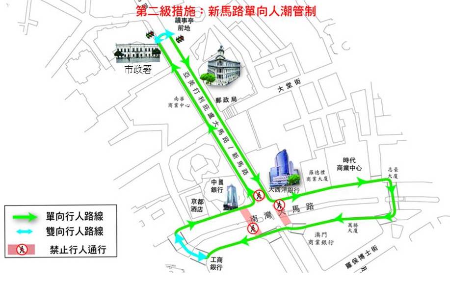 当第一级措施未能解决人群持续挤拥问题时,在第一级的基础上,新马路将实施单向人潮管制。行人需遵照附图所示‘倒T’字型单向行进路线前往议事亭前地、大西洋银行、汇丰银行、商业银行、工商银行、中国银行及市政署等地点。