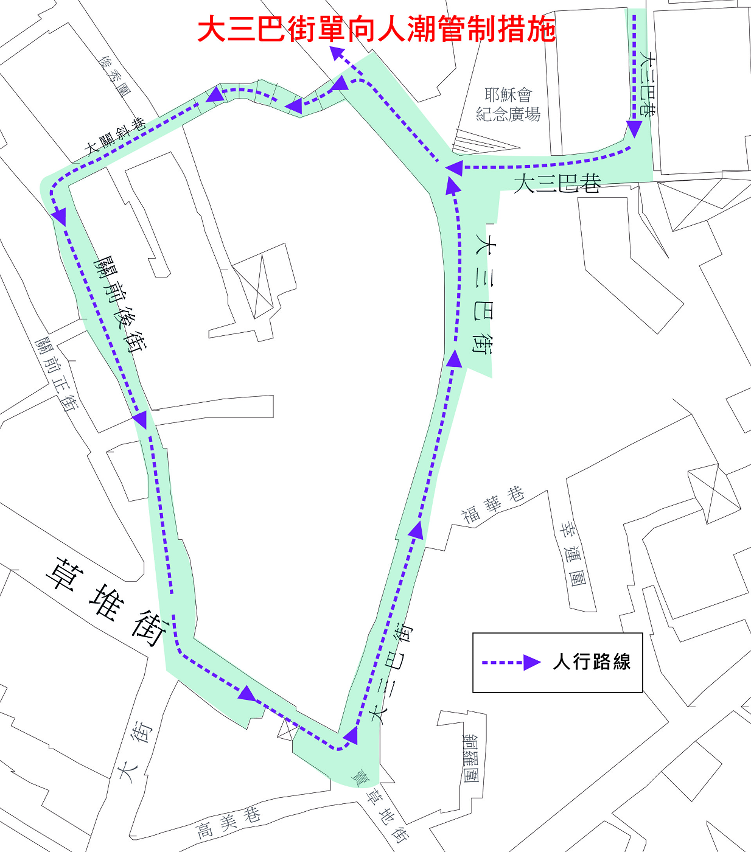 当大三巴街(手信街)人群出现挤拥时,将会实施单向人潮管制措施,人流只可单向上行往牌坊,并取道周边的街巷如大关斜巷、关前后街、高园街等离开。