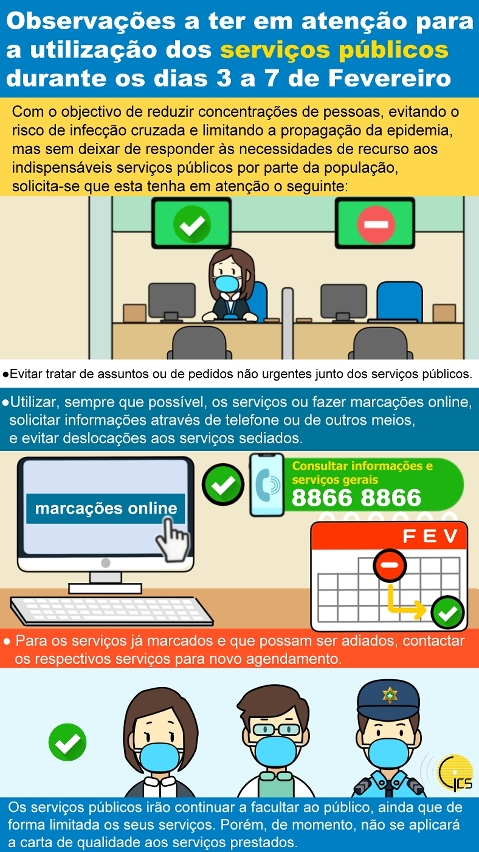 为防止新型肺炎的传播,有必要控制公共部门的人流,减少交叉感染的机会,但同时考虑到市民对公共服务的需求,特区政府决定由2月3日至7日,维持公共部门有限度的基本服务。在此期间,希望市民可推迟办理非必要或紧急的公共服务,尽量透过电话预约或网上申请,减少前往公共部门。已预约但可延期的服务,可和有关部门联络,另作安排。