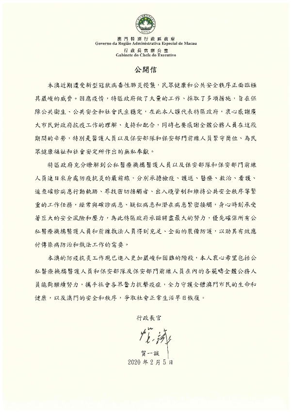 「本澳近期遭受新型冠状病毒性肺炎侵袭,民众健康和公共安全秩序正面临极其严峻的威胁。因应疫情,特区政府做了大量的工作、采取了多项措施,旨在保障公共卫生、公共安全和社会民生稳定,在此本人谨代表特区政府,衷心感谢广大市民对政府抗疫工作的理解、支持和配合,同时也要感谢全体公务人员在这段期间的辛劳,特别是医护人员以及保安部队和保安部门前线人员紧守岗位、为民众健康福祉和社会安定所作出的无私奉献。