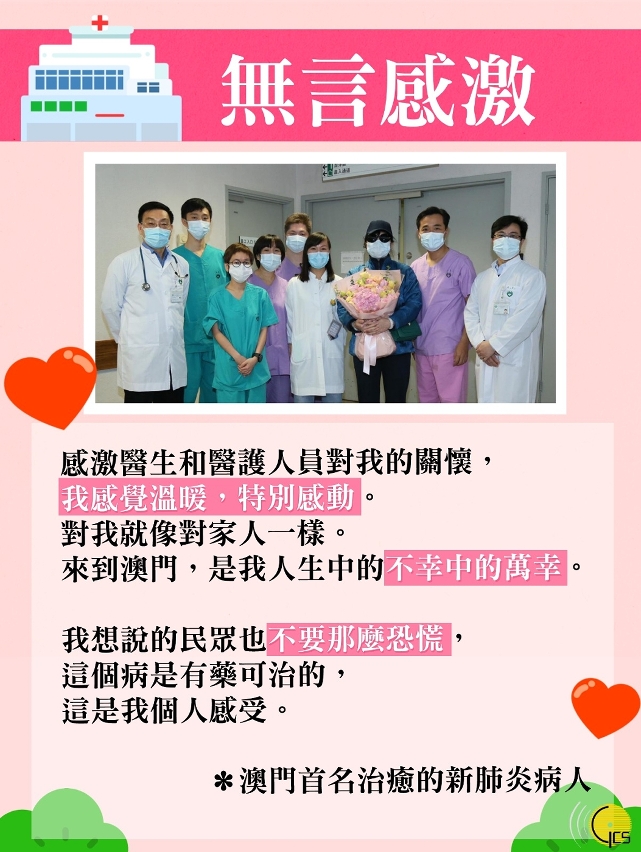 澳门首名治愈的新型肺炎病人:感激澳门医护人员照顾。来到澳门是我不幸中的万幸。