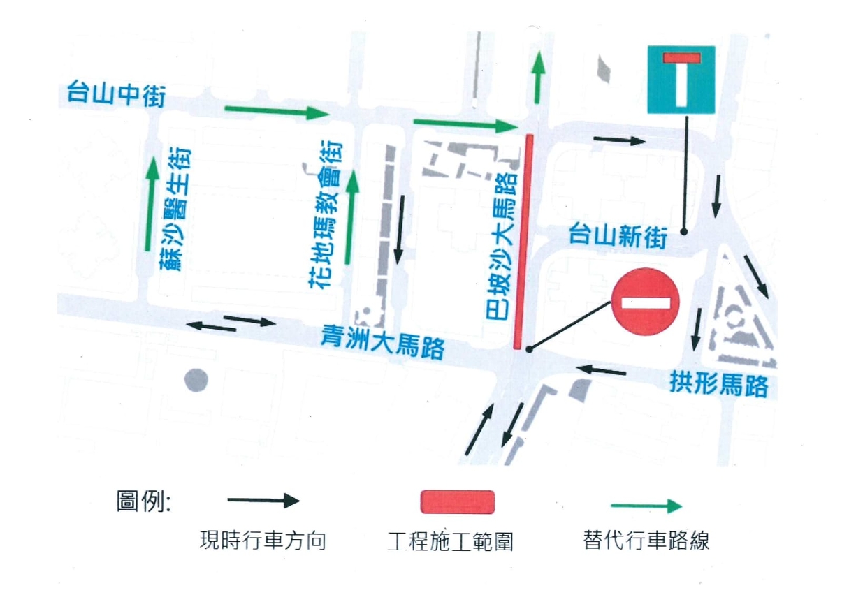 其中,自来水公司进行行人道整治及水管铺设工程,2月10日(周一)起,巴波沙大马路及周边道路实施交通管制,同步巴士服务作出调整,相关路段之咪表泊车位暂停使用。就是次工程之开展及各项临时交通安排,交通事务局早前联同自来水公司先后拜访台山坊众互助会及邻近施工地点的多间学校,介绍施工安排及听取意见。