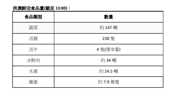 供澳鲜活食品量(截至13:00):