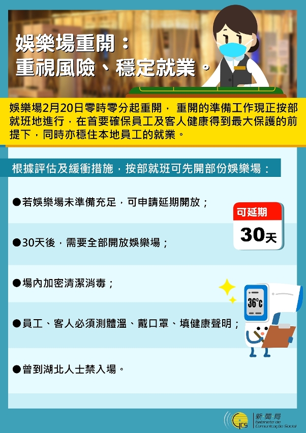 本澳娱乐场将于2月20日零时零分起重开,特区政府推出进一步的全面防疫措施,要求所有博企严格执行,提供卫生及安全环境,在首要确保员工及客人健康得到最大保护的前提下,同时亦稳住本地员工的就业。