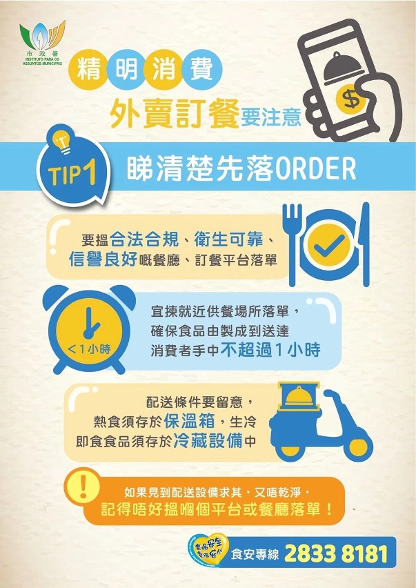 为减少人群聚集,降低疾病传播风险,居民避免在餐饮场所堂食,并以外卖方式消费。为此,市政署提醒消费者,须清楚所订购的外卖食品可能存在的食安风险,消费之前必须慎选卫生可靠、信誉良好的餐厅食肆或第三方网络餐饮配送平台;同时留意运送条件,如必须配备安全且卫生的运载设备,热食须存于保温箱,生冷即食食品须存于冷藏设备中,尤其高风险生鲜即食食品(如刺身、生蚝及沙律等)要特别留神,若没有适当的保冷运送设备,则不应落单。