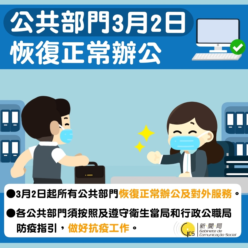 所有公共部门于3月2日(下周一)起,恢复正常办公及对外服务;同时,为了持续降低病毒传播风险,各部门仍须遵守各项防疫指引,全力做好防控工作。敬请前往办理手续的市民,要配合和支持各部门的防疫措施!