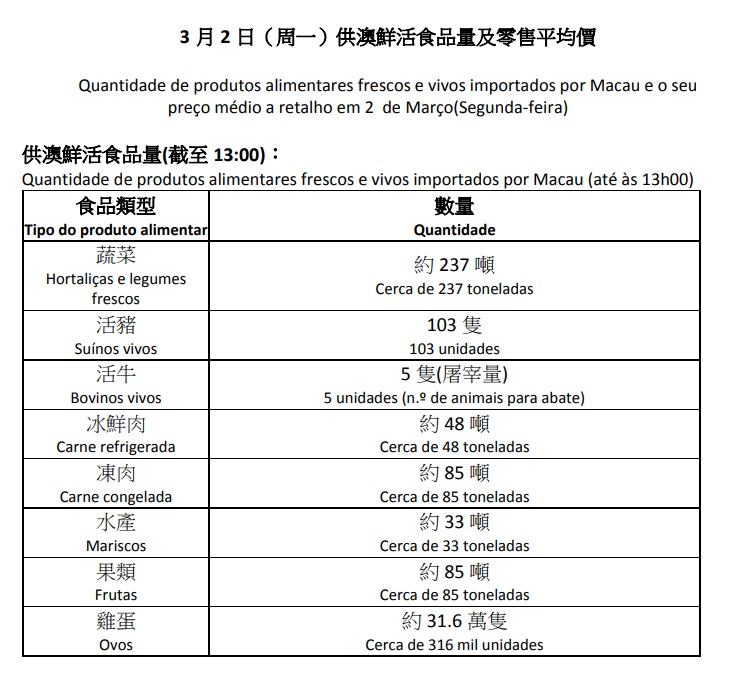 供澳鲜活食品量(截至13:00):