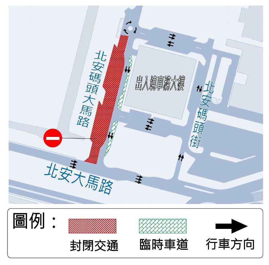 电力公司建造变电站,北安码头大马路近出入境事务厅路段现已实施有限度通车,配合施工,由3月6日(周五)至2021年4月19日(周一),北安码头大马路往北安码头二巷方向路段封闭交通,该路段咪表泊车位暂停使用,前往出入境事务大楼之车辆可取道北安码头街。交通事务局呼吁驾驶者留意。