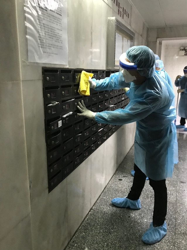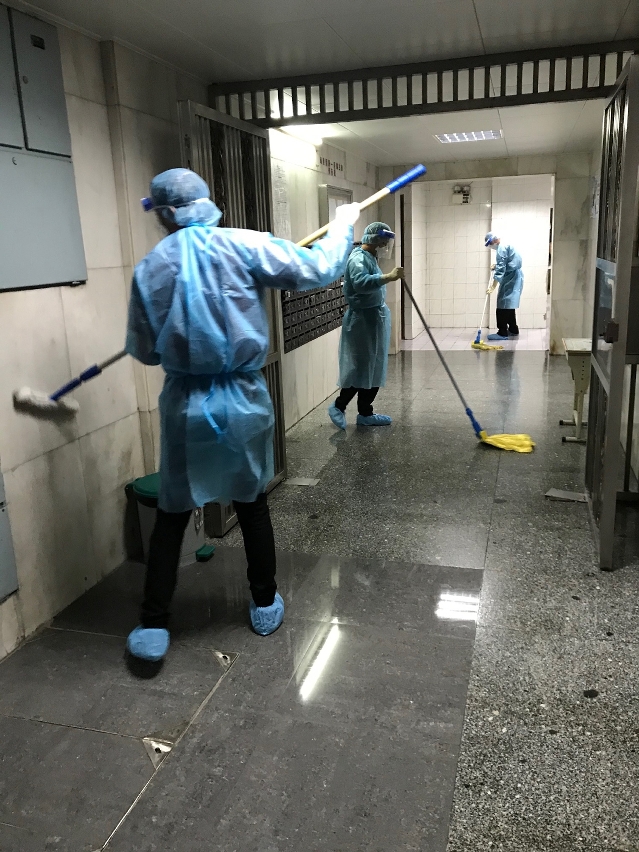 人员到确诊病例居住大厦进行清洁消毒