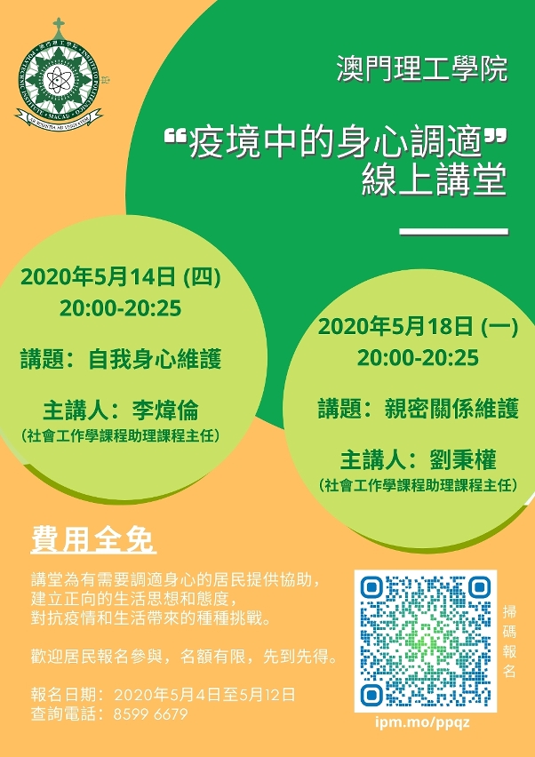 因应疫情中的环境,澳门理工学院人文及社会科学高等学校社会工作学课程发挥其专业所长,推出 “疫境中的身心调适” 线上讲堂,费用全免,希望为有需要调适身心的居民提供协助,建立正向的生活思想和态度,对抗疫情和生活带来的种种挑战。